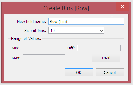Next step is to create some bins. Right click on the Row in the Dimensions shelf and click create Bins. I made the size of bins equal to 1, so I would end up generating a series from 0 to 10,000 consisting of 10,001 bins. Double click on the new field (Row (bin)) to add it to worksheet. By default only 2 rows (0 and 10,000) are shown. If you right click on the pill in the Rows shelf and select ‘Show Missing Values’, then voila the missing 9,999 values appear in the grid. So far so good.