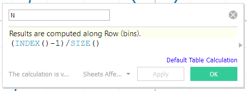 Next want to convert this range into a percentage. As I need this as a sequence and the specific values specified in the file don’t matter, using the Index and Size table calculations to create this and fixing the calculation over the bins: