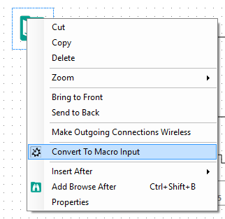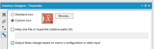 After that need to replace the Browse tool with a Macro Output tool. Finally a little bit of reconfiguring to specify that the output depends on the input and add an Icon.