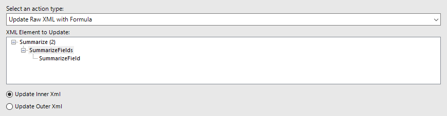 The action tool is going to need to rewrite the section inside the SummarizeFields Node and replace it with some dynamic Xml. We know we are going to want to keep the Sum_Weight and the GroupBy Constant but are going to have generate a set of GroupBy entries depending on the values selected. So first we change the Action tool to target the correct Xml node and tell it to update the Inner Xml based on a formula.