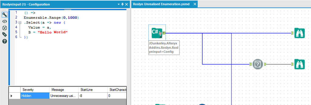 For a little while I have been wanting to attempt to integrate the Roslyn compiler into Alteryx and allow you to create a .Net script that it uses at run time. This release includes the first proof of concept tool on these lines. This allows you to create a lambda expression returning either a single object or an enumerable set of objects (must be an IEnumerable) which the tool will push into the Alteryx.